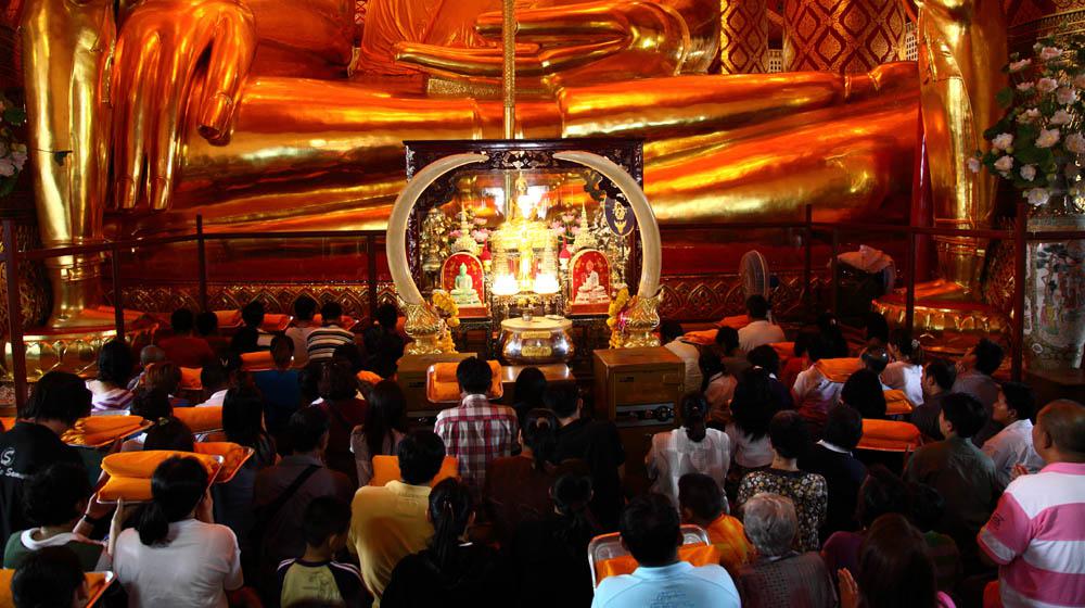 | 仏像の前では多くの参拝客がお祈り捧げてます。日本のお寺でのお参りとは異なり、皆長い時間お祈り捧げてます。 |
