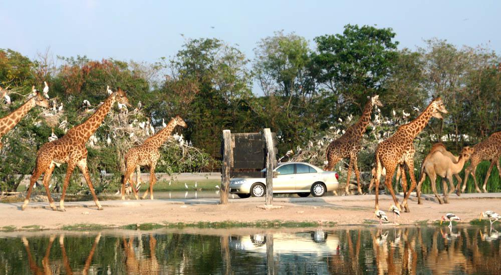 WAR」と呼ばれるアトラクションなどが見れたりと、特にバンコクを一通り見たお子さん連れのご家族には、一度訪れてみるのも良いかも知れません。 キリンとかの群れの中を車で通過すると、もう凄い迫力ですよ~。 |