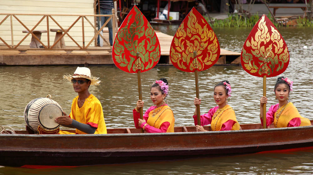 女性三人、その他太鼓を乗せた小舟がゆったり流れます。女性が手にもつ葉っぱの形のようなもの、これはなんでしょう?菩提樹の葉っぱなのかな? |