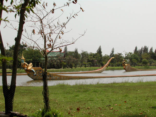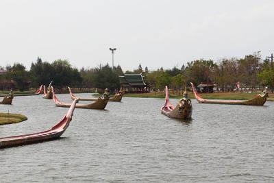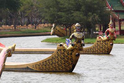 The Royal Water-Course ProcessionA lot of boats like Royal Barges are on the big pond. The late Ayutthaya became rich and well-known among foreigners as one of the important trade cities in South east Asia. To celebrate the prosperity and dignity of the kingdom, many state ceremonies and artistic work were created, and a group of royal barges were also initiated on this occasion. The royal barges, adapted from war ships, were used in many important state ceremonies such as the reception of the royal guests and the royal procession welcoming diplomats and carrying royal letters or commands. |