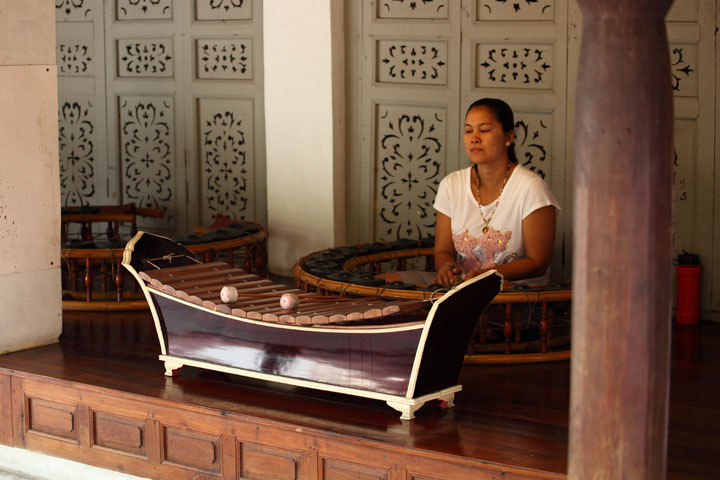 Musical instrument 3 The musical instrument in front (like a xylophone) is "Ranard". The one in front of the woman is "khongWong" with a lot of bells. |