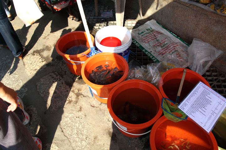 | A lot of fish Because people feed them, fish gather a lot. This scenery can be seen often around temples in Thailand. |