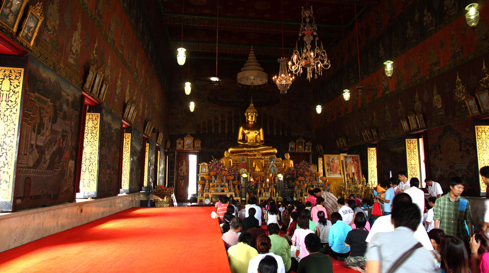 | In the main hall A Buddha statue is housed. A lot of people are praying. |