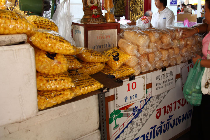 | You can let them swim away in the river to accumulate virtues. | Around the entrance. Flags of Thailand and Buddhism. |