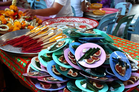 | You'll a lot of things are sold around the pier like a market. | Offerings to visit a temple. | ||