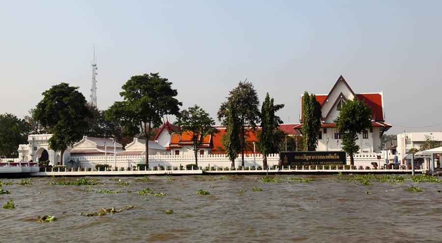 | Looks like they are navy boats. | The view of the Chao Phraya River. | Royal Thai Navy Headquarters. | Navy facility. |