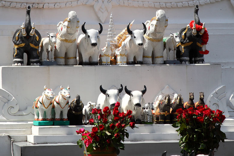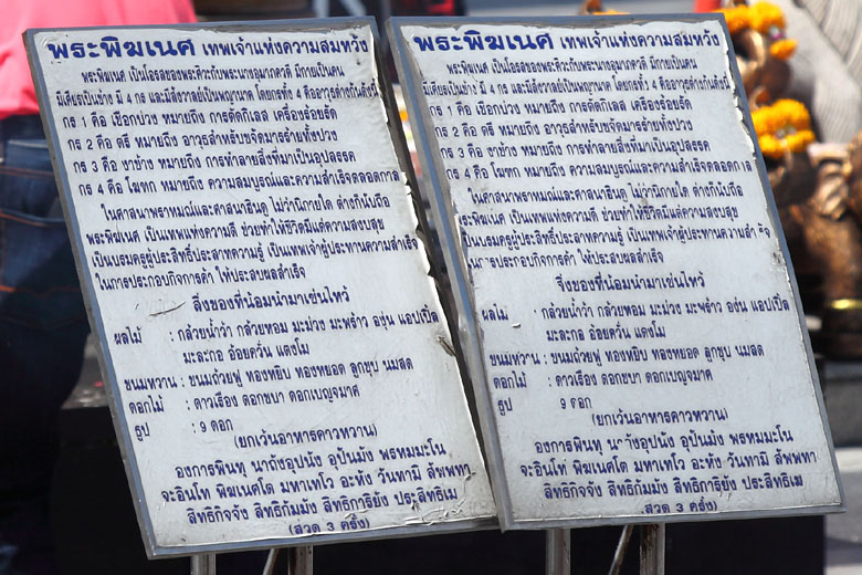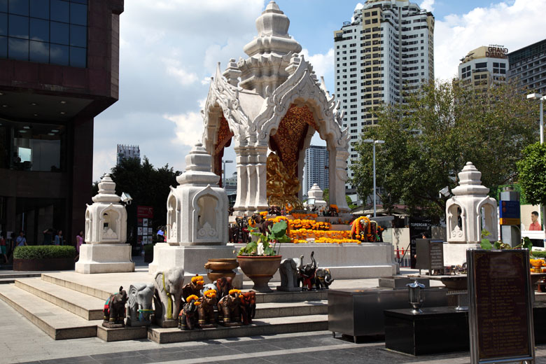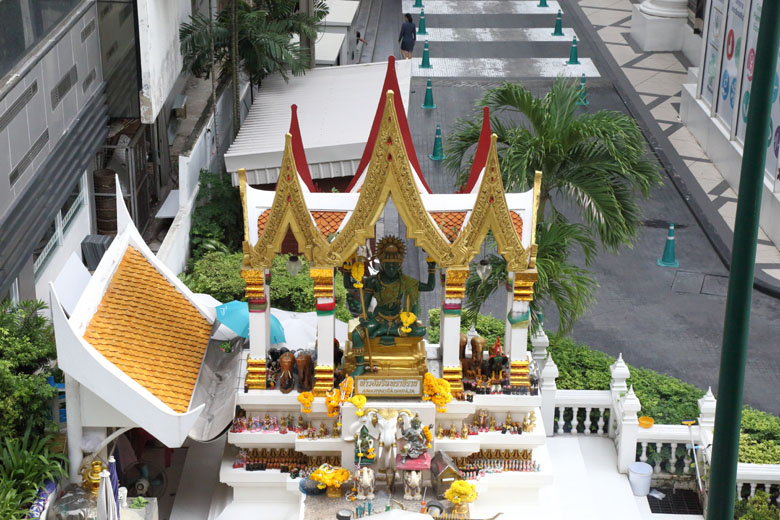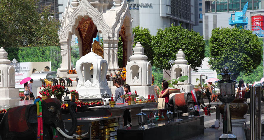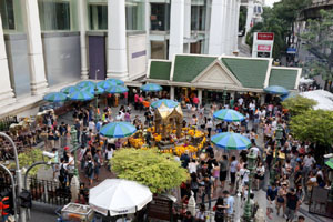 The Power Spots in front of ISETAN at Central World, TRIMURTI SHRINE - the God of Love and GANESHA SHRINE - the Elephant God of wisdom, education and remover of obstacles.The bigger shrine on the left is TRIMURTI shrine. Trimurti made up of the three Hindu gods, Brahma(the creator), Vishnu(the preserver) and Shiva(the destroyer), is the God of Love. The smaller shrine around the center of the picture is Ganesha shrine, the Elephant God. Thailand is a Buddhist country but you'll see Hindu Gods here and there especially Ganesha often. Very curious. (About Ganesha: see Wat Samanratanaram famous for Thailand's largest reclining Ganesha. If you visit around Central World, don't forget to drop by this Power Spots ! |