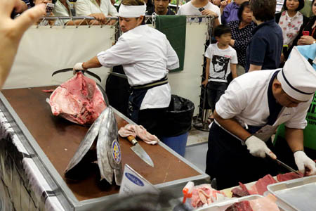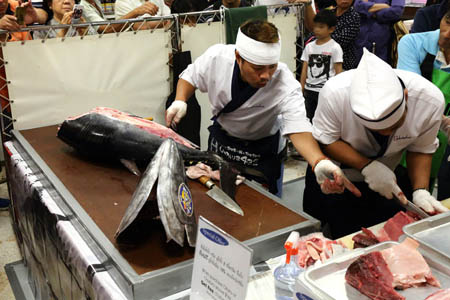 | Tuna Cutting Show 1 Wow, they brought the big tunas from Japan for this event. Thank you. |