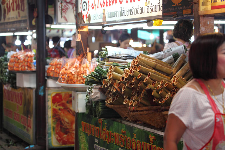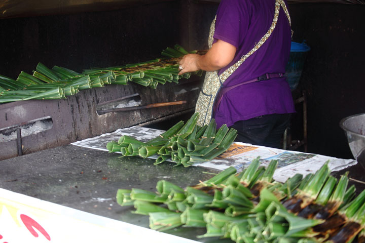 | Khao Laam A popular sweet snack in Thailand, baked sticky rice mixed with coconut milk and a little sugar in a bamboo stick. |