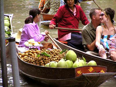 (Boats with a lot of fruits on past tourists.) |