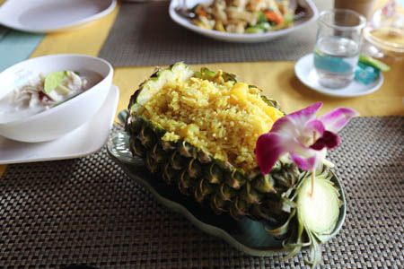 | Taxi fee. Well, well, this is maybe quite expensive, isn't it ? They have a taxi to go to Hua Hin. (Who will go there by taxi from here ... ???) | Thai sweets. She beat an egg and put banana pieces on it. We took it back to the hotel for a night snack. | Fried rice in a pineapple at a restaurant. It was colorful with other vegetables on the rice in the menu but ... |