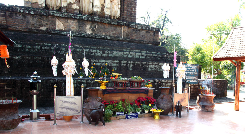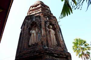 the 17th to 18th century B.E.(around 11th to 12th century A.D.) founded by Pha-Ya Sapphasit during the golden age of Hariphunchai kingdom. Situated just next to the main hall, diameter of the octagon base is 4.40 meters and the height of the chedi is 11.50 meters. The Buddha images in the first tier niches are in a standing position. The second tier, houses Buddha images in meditation in Hariphunchai style influenced by Dvaravati art of central Thailand. (Dvaravati is said the first Mon kingdom flourished from the 6th to the 11th century) |