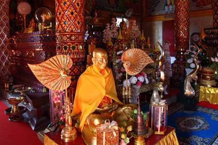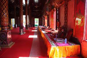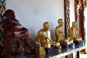| Another inside view. | Chairs for monks on the side of the hall. | Other monk images outside of the hall. |