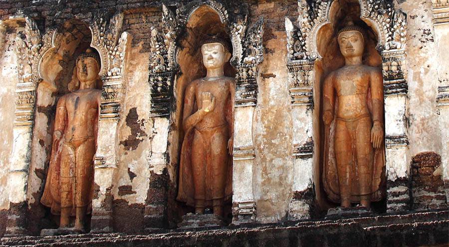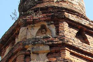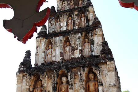 | Another angle. | The first tier. Standing Buddha images. | Upper tier. A Buddha image in meditation. |