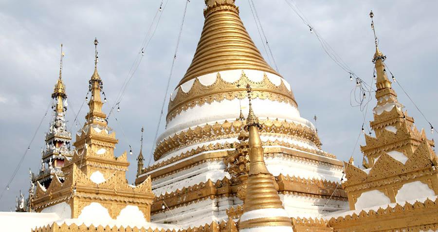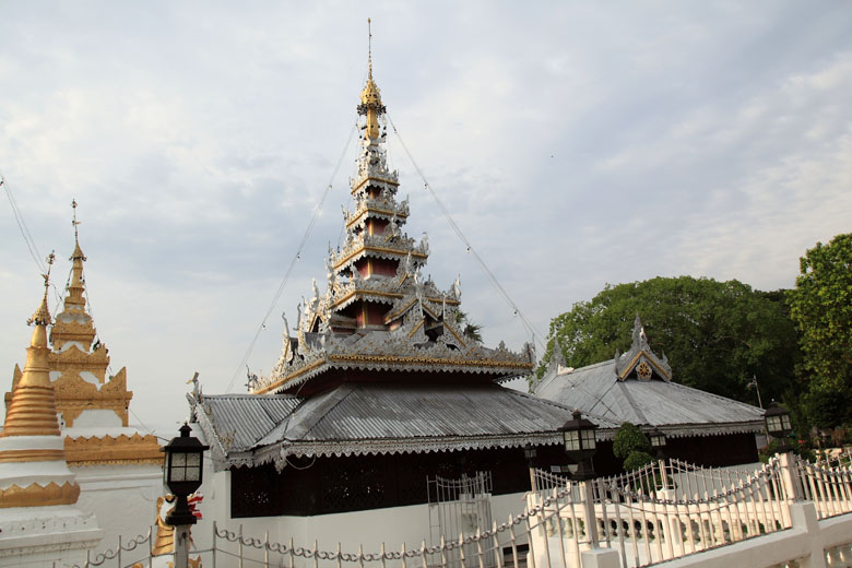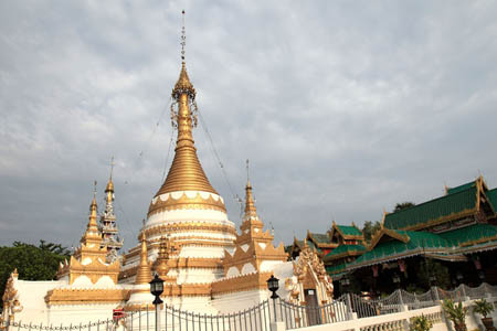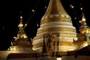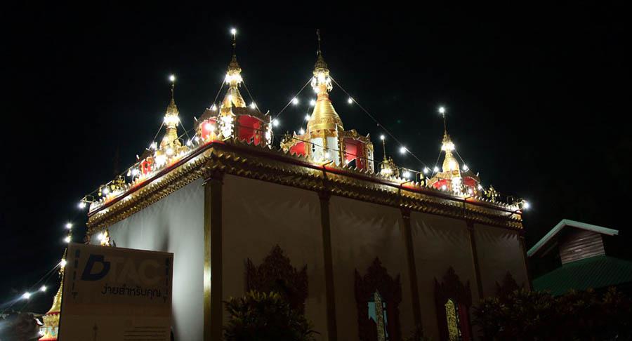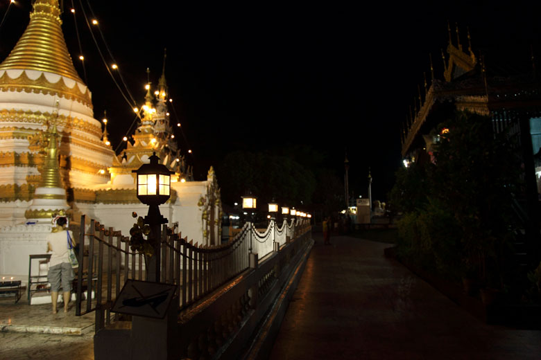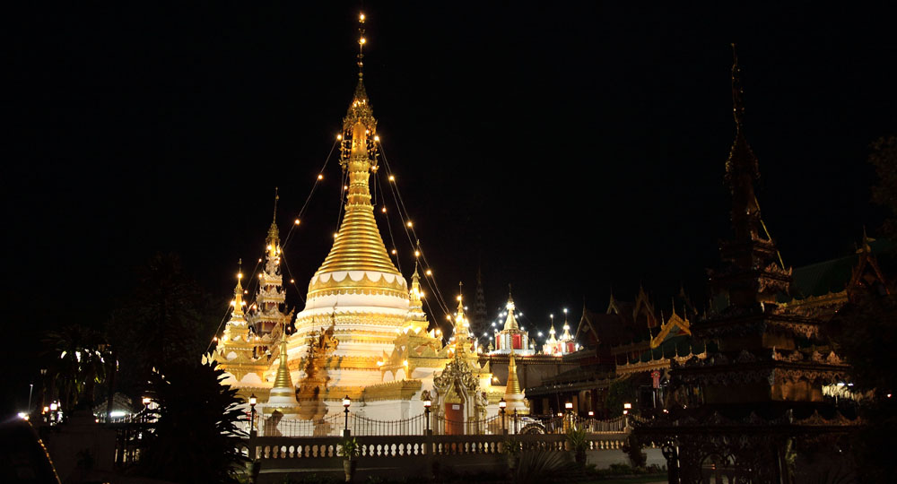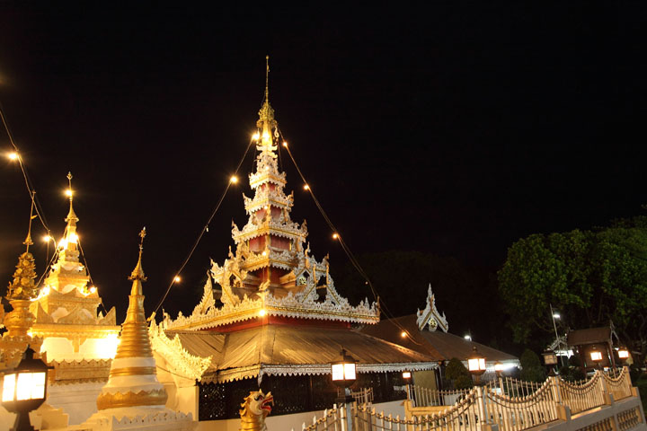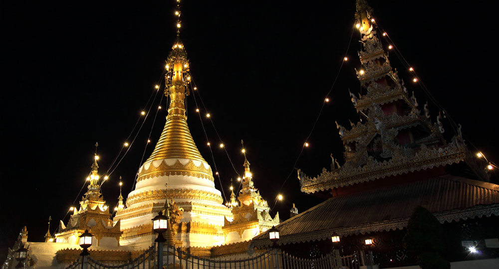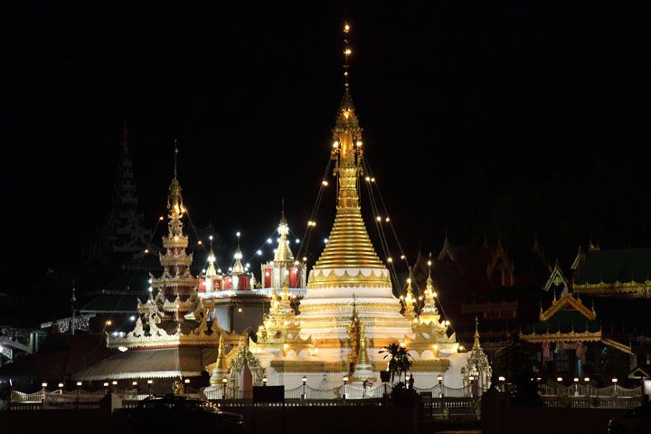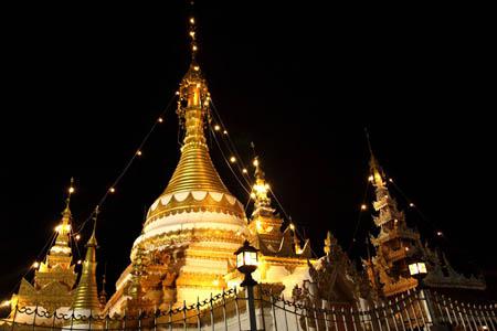 The chedi in the Burmese Shan style lit up next to the golden chedi. |