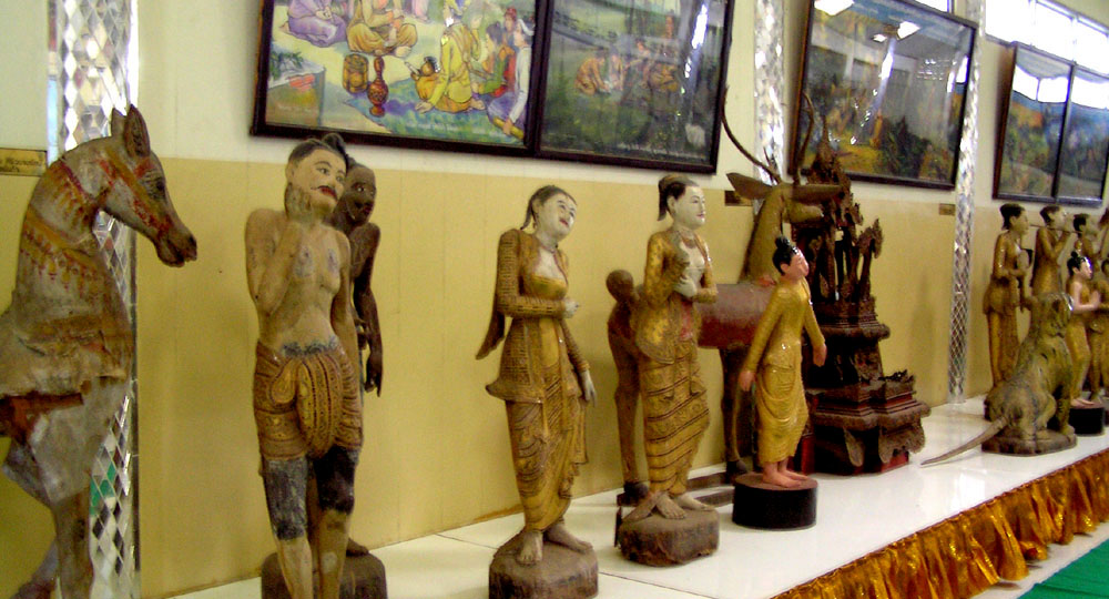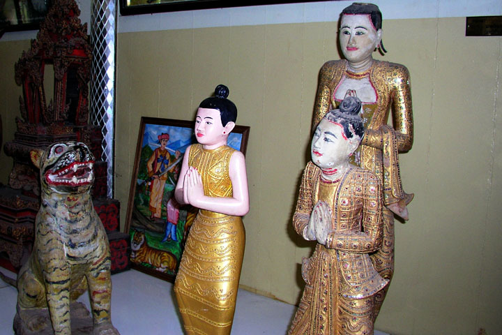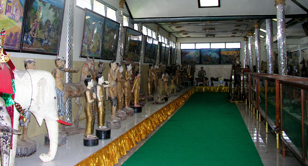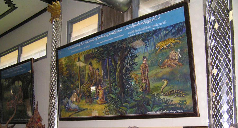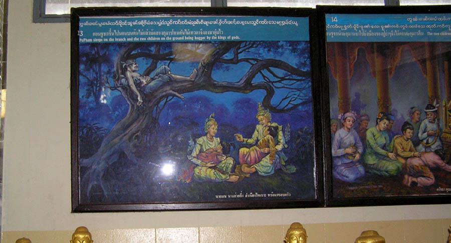 There are also glass paintings depicting the Vessantara Jakata as well as the life of Prince Siddhartha and folk ways of life in the old days. According to a record, they were painted by Myanmar artisans from Mandalay.