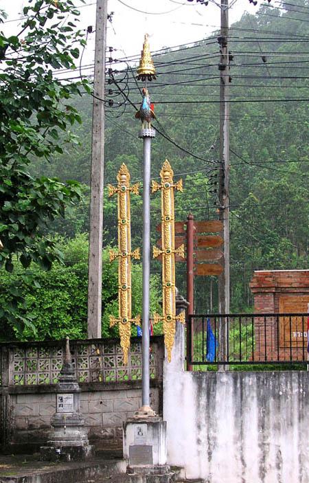 | A little lonely board in the rain. | The yellow flag indicates Buddhism. |