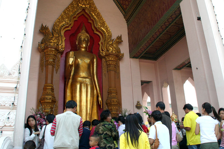 end of 2006. "Pra Pathom Chedi" is one of the main royal temples and located in Nakhon Pathom, about 60 km west of Bangkok. The huge orange tiled chedi is about 120 meters high, 65 meters in diameter and stands on the base, 240 meters around. Nakhon Phanom is the place where Buddhism was introduced first in Thailand. Around the 3rd century B.C., King Asoka sent missionaries here to spread Buddhism and the original chedi was built. Although the chedi was destroyed by Cambodia in 11th century and left deserted, Rama 4 found it and commanded the reconstruction of a new huge pagoda covering the original one in 1853. It took about 20 years to finish it until the reign of Rama V. During the era of King Rama VI, Phra Pathom Chedi was renovated and the temple became the royal temple of King Rama VI. The relics of King Rama VI are housed in its base. As the birthplace of Thai Buddhism, Nakhon Phanom has a big festival on a night with a full moon in November every year with a lot of people from all over the country. |
