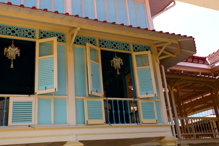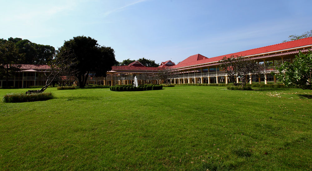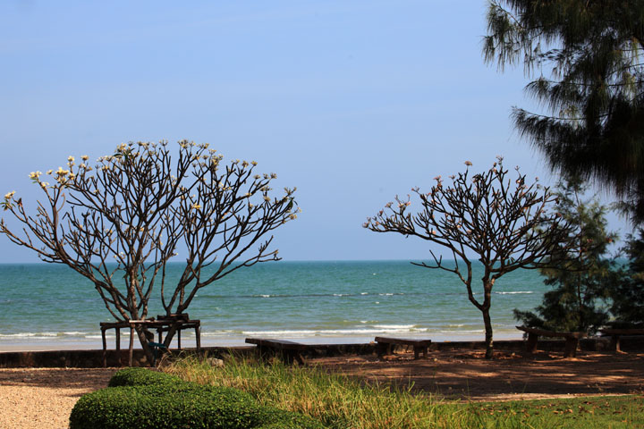 An Italian architect was hired to design the palace.Talking of palace and teakwood, you may come up with the "Vimanmek Mansion Palace" in Bangkok, however, this palace, Maruekhathaiyawan Palace, is a one-story building and has a total of one thousand and eighty pillars with three parts of the area: the area for the royal family in the right, for the royal retainers in the left and the area for the reading room, sitting room and drawing room around the center. The passage to the ocean and small buildings on the beach are very impressive. |