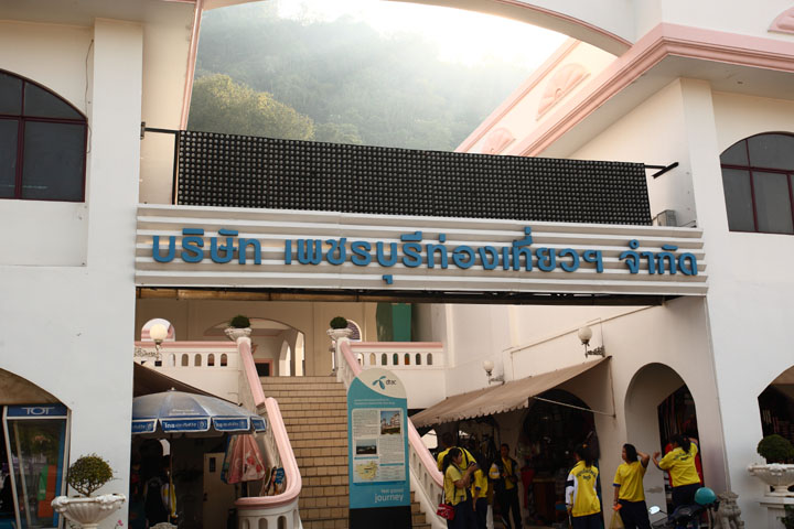peak is 95 meters high.There are three peaks, the western, the central, and the eastern peaks, and the palace on the western peak, the chedi on the central peak, the temple on the eastern peak can be seen. This mountain (or hill) was called "Khao Samon" (Samon Hill) long time ago. ("Khao" means "hill" or "mountain".) After the Phra Nakhon Khiri Palace was built by Rama IV, this mountain turned to "Nakhon Khiri". However, people still call it like in the old way, "Khao Wang" (Palace Hill). ("Wang" means "palace".) You can go up by cable car. (I don't know if there is a walk way up to the top.) Now, here we go ! :D |