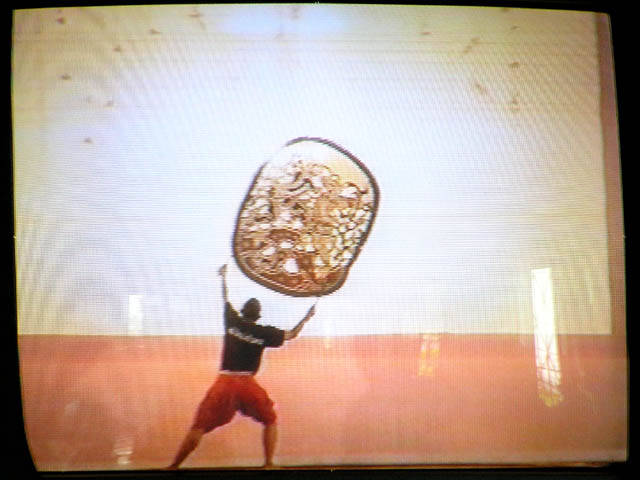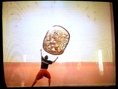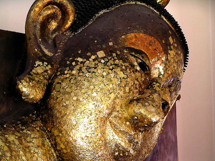 (Close-up. A lot of pieces of leaf gold are on the statue.)