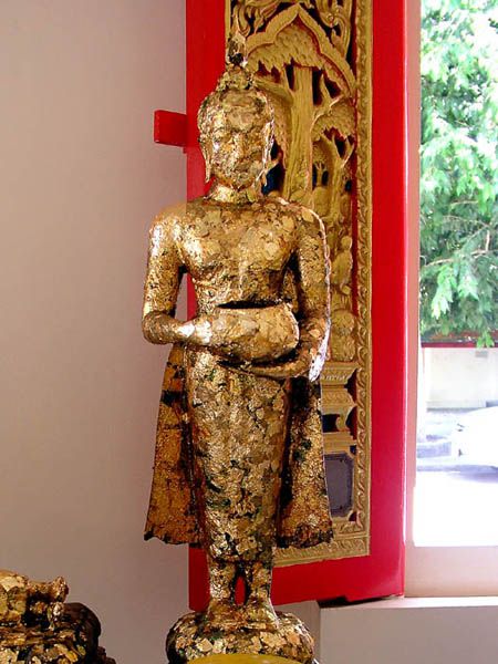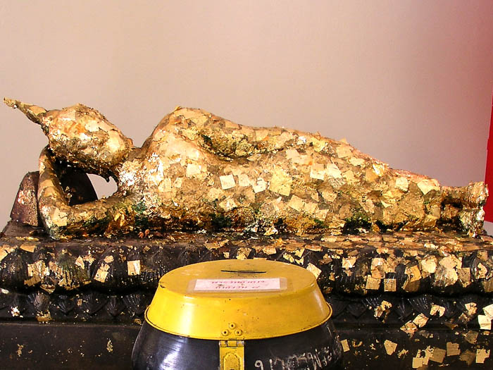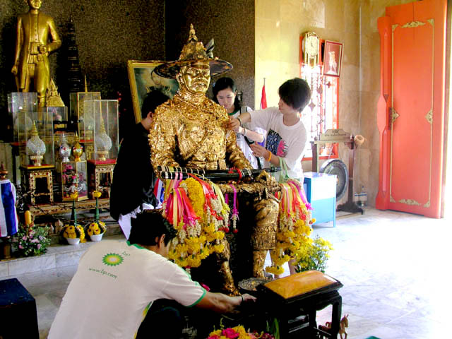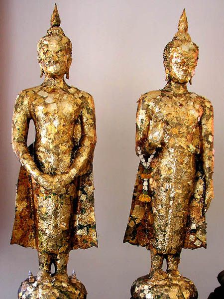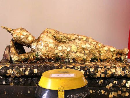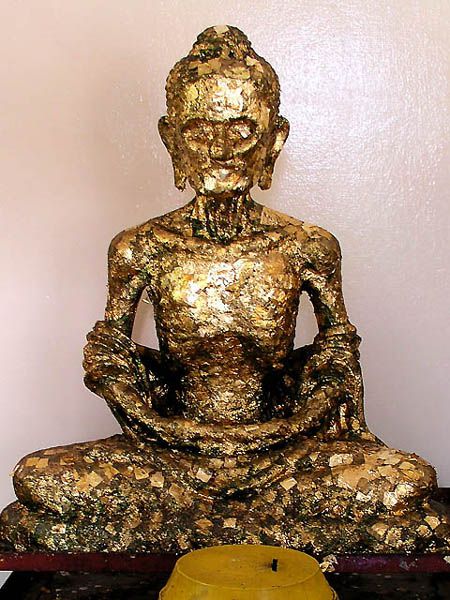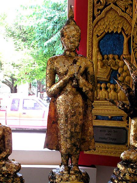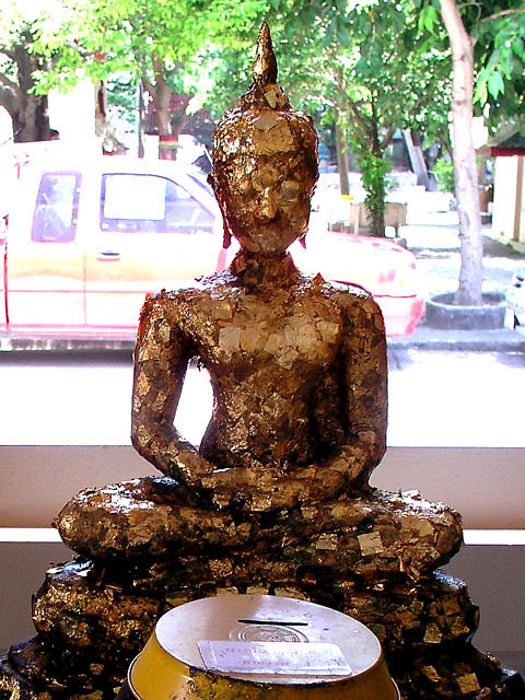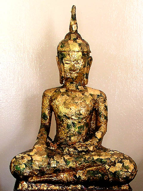 (People praying put pieces of leaf gold as they like on the statue.) |