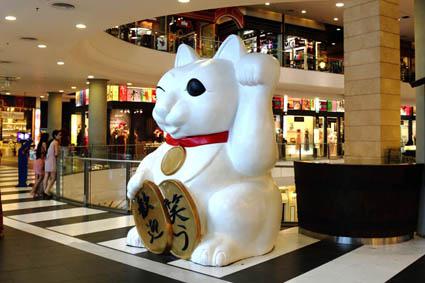 Welcoming cat and shrine gate. "笑う" of the cat is kind of funny