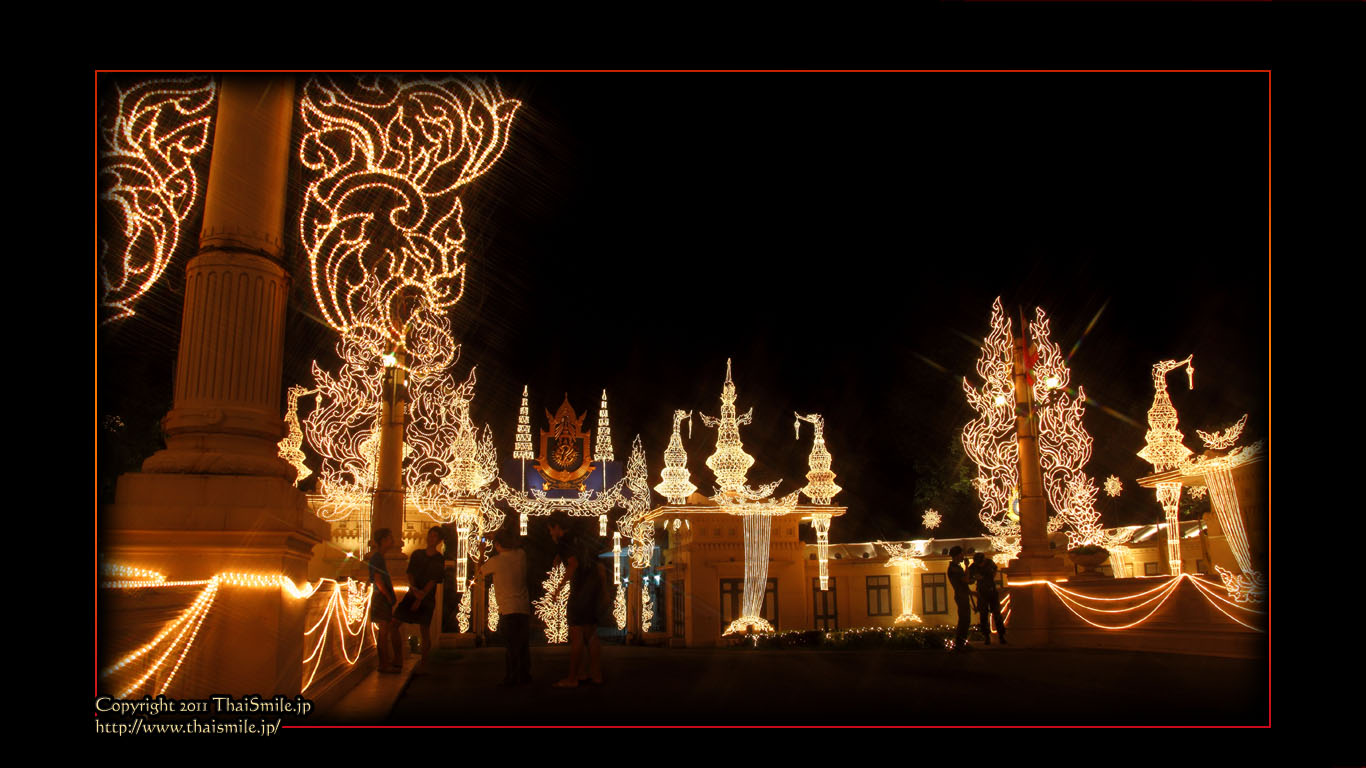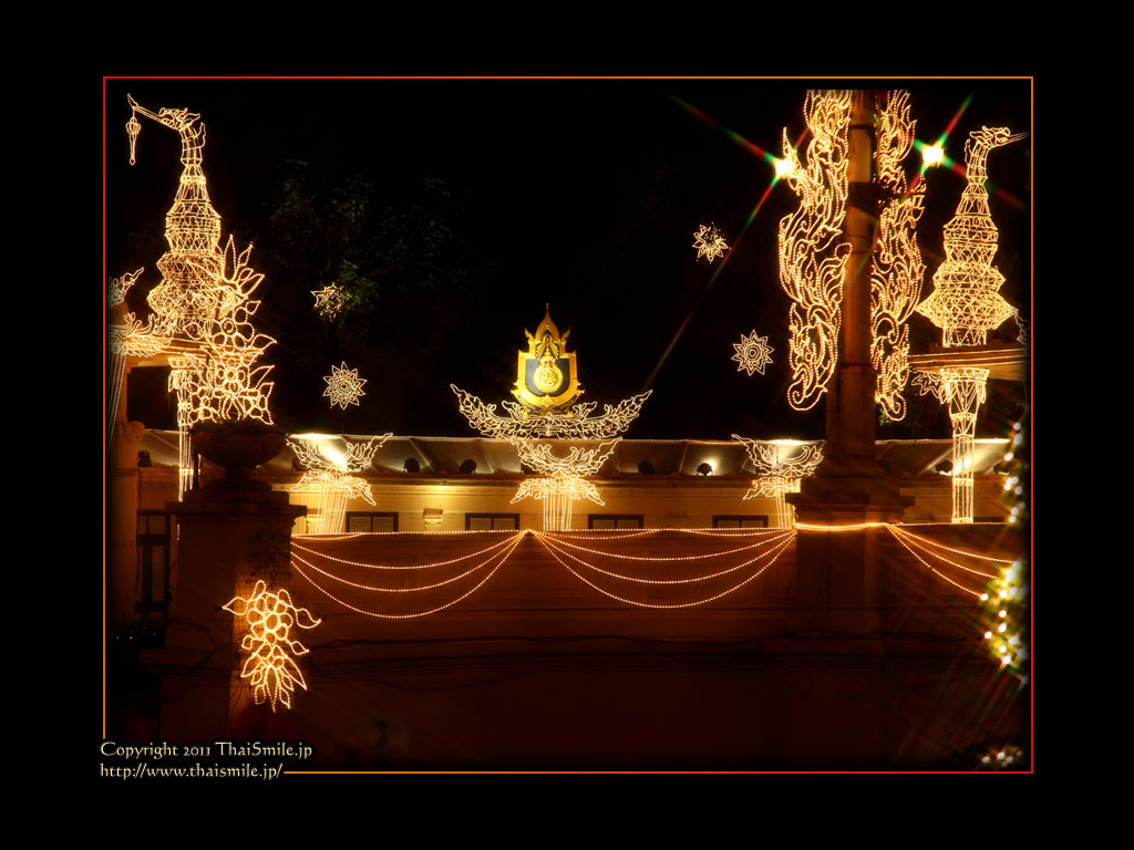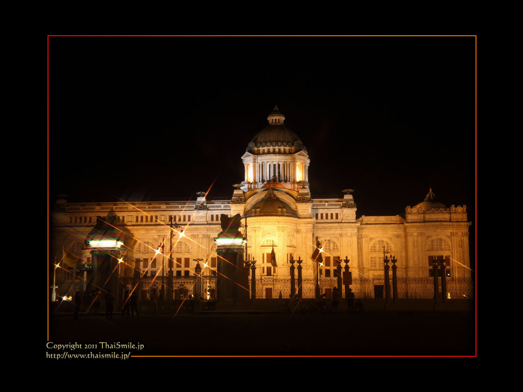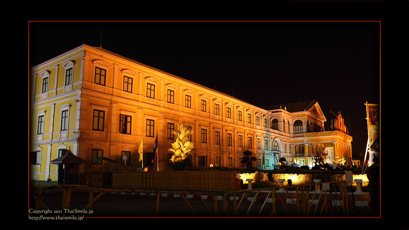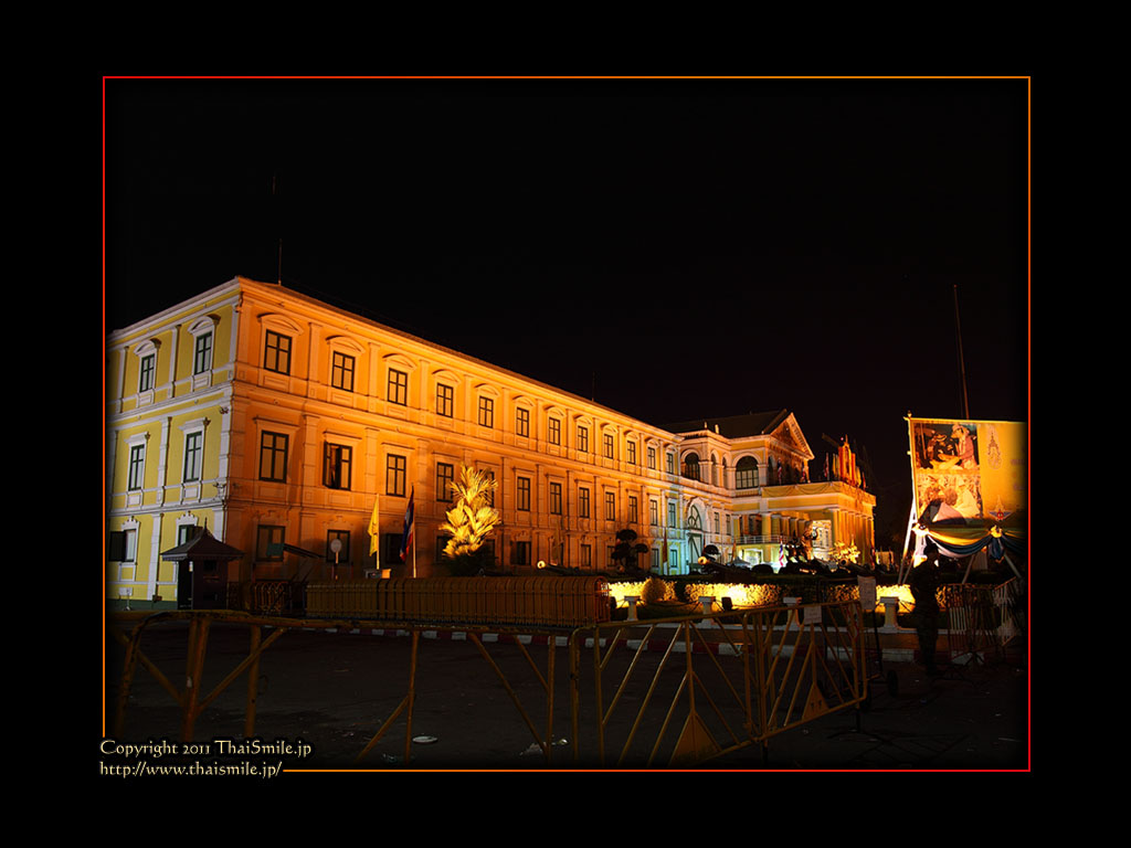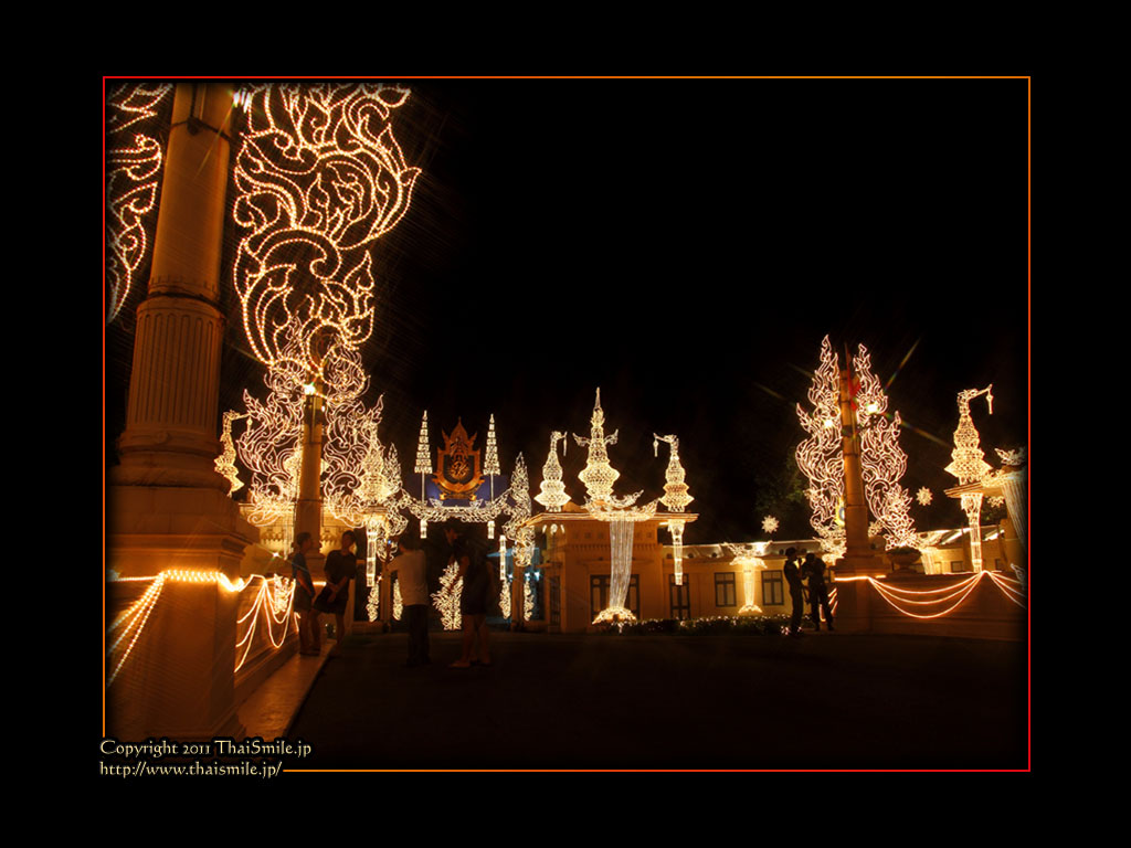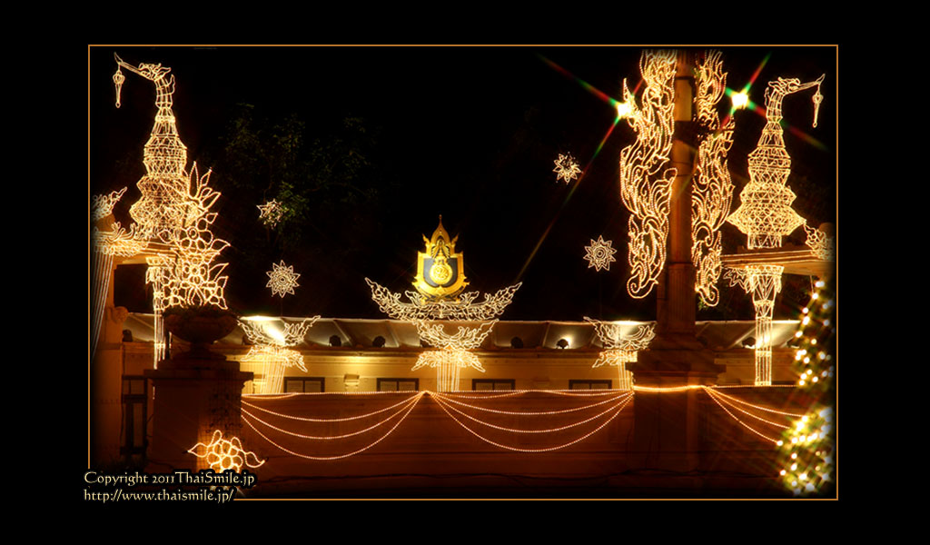 | Chitralada Villa, Dusit Palace バンコクでの国王の住居。その宮殿の前の夜の風景です。 電飾されて、とても綺麗ですね。 |
