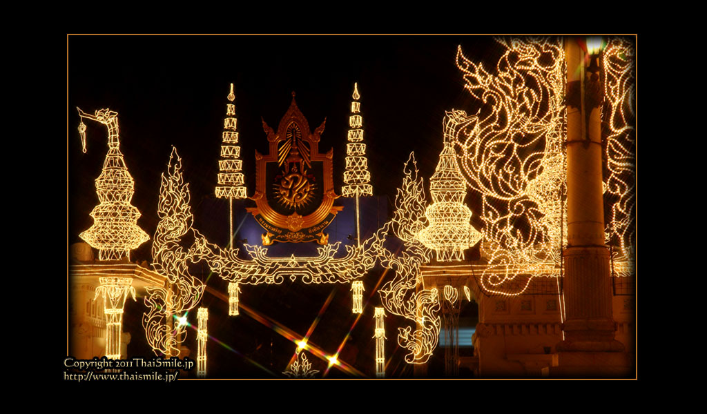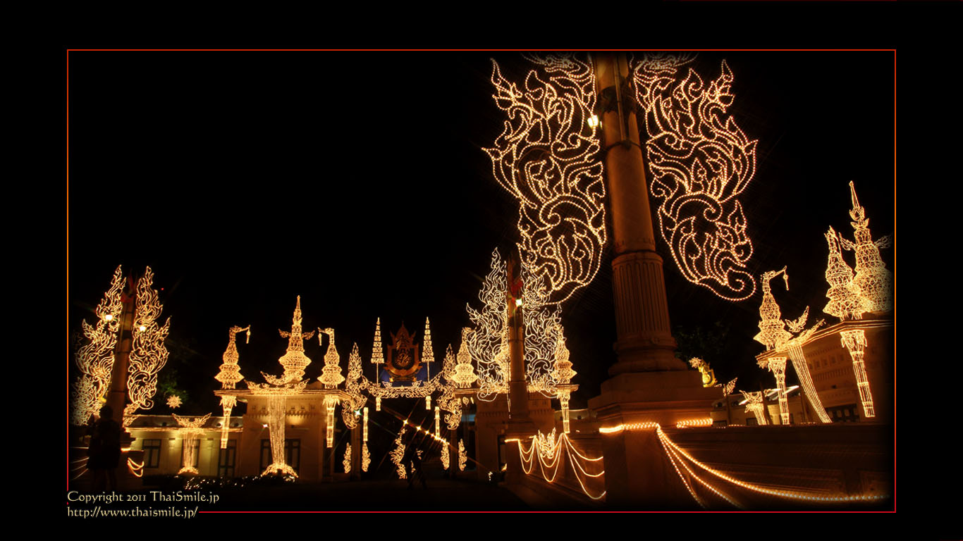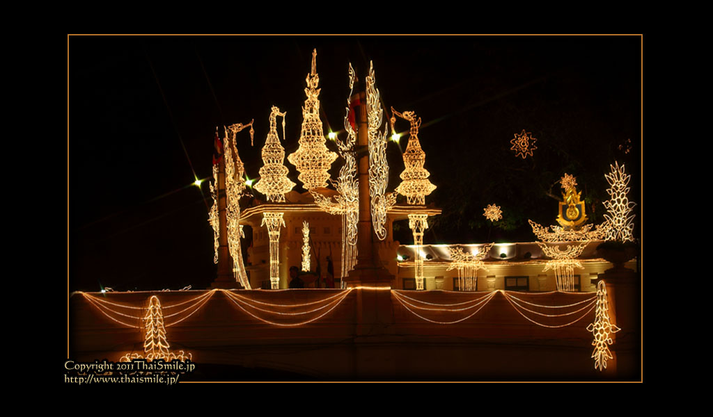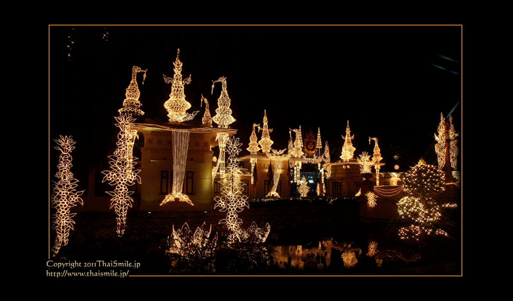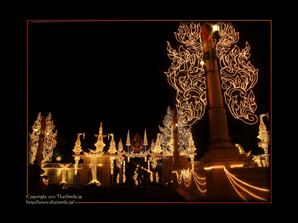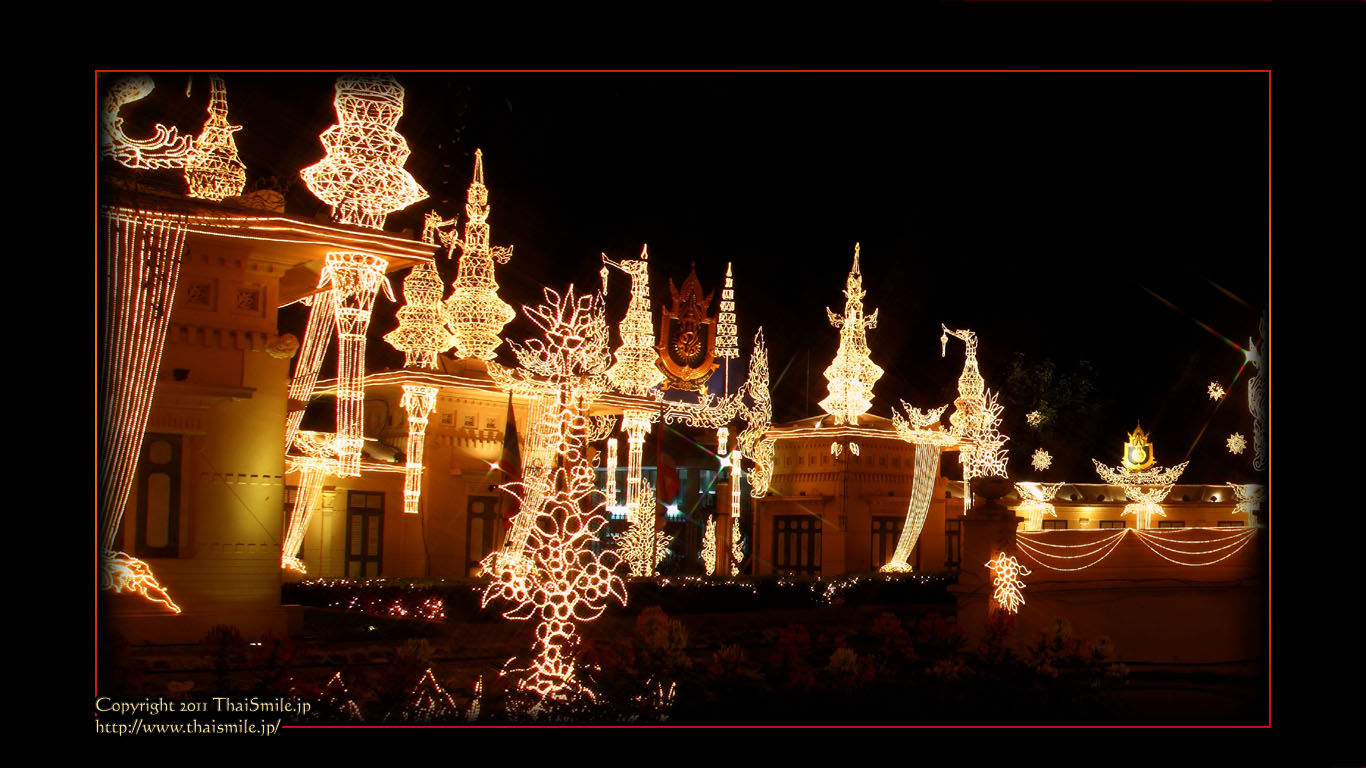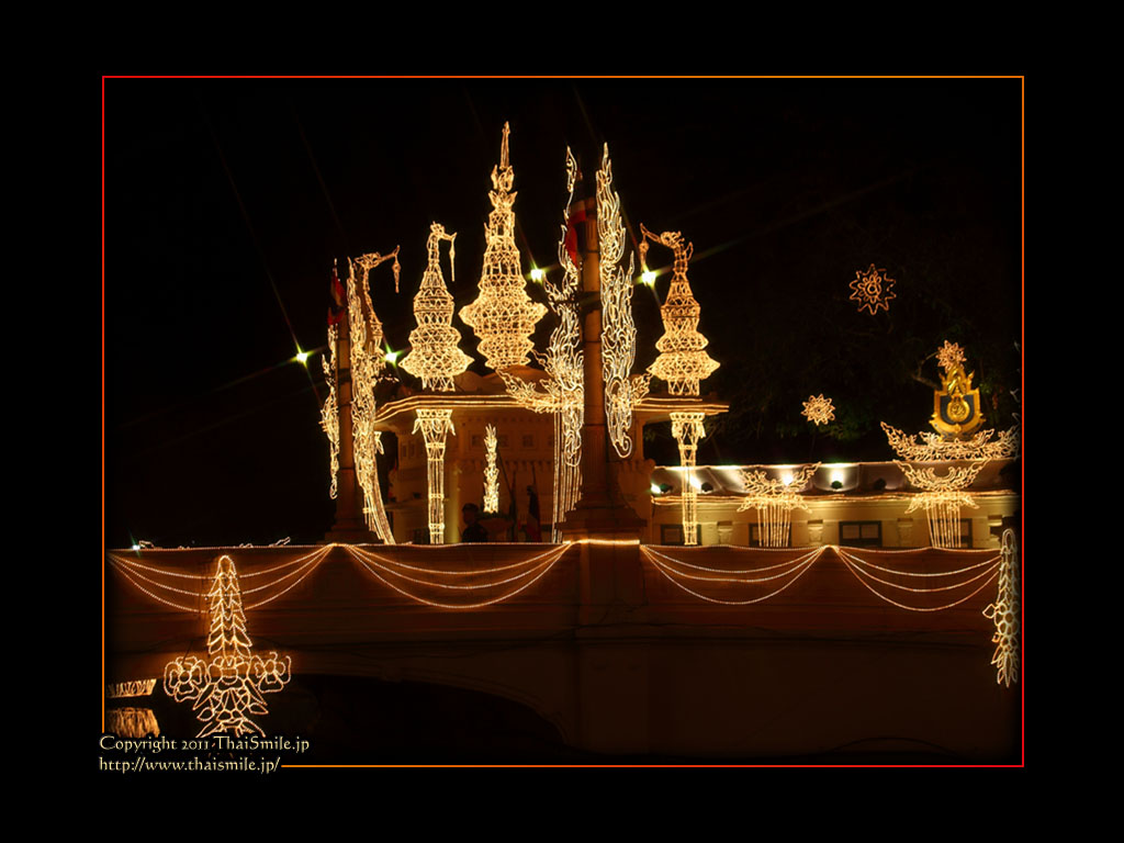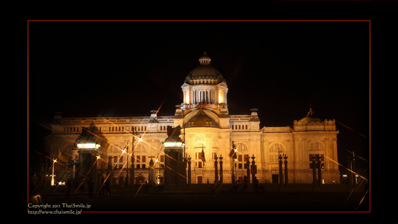 | Chitralada Villa, Dusit Palace バンコクでの国王の住居。その宮殿の前の夜の風景です。 電飾されて、とても綺麗ですね。 |