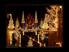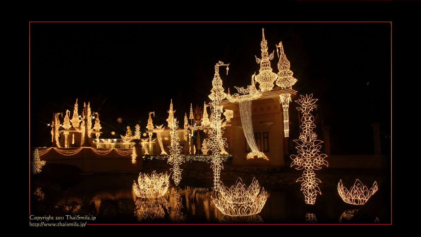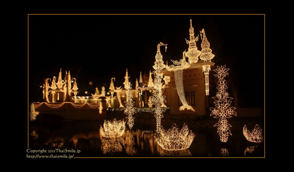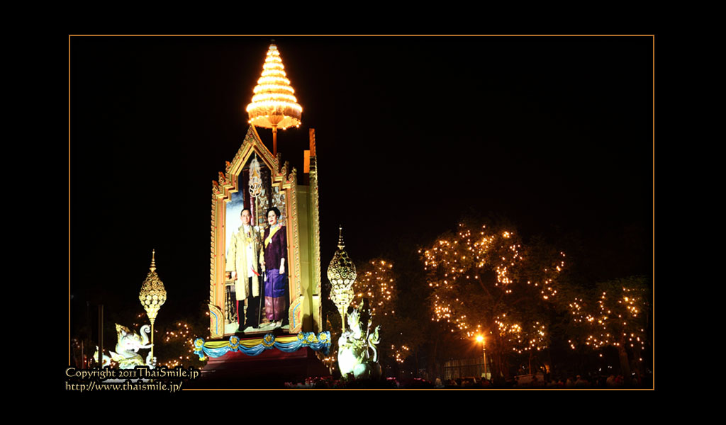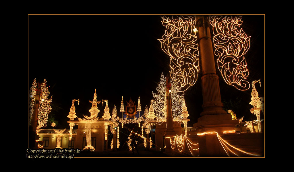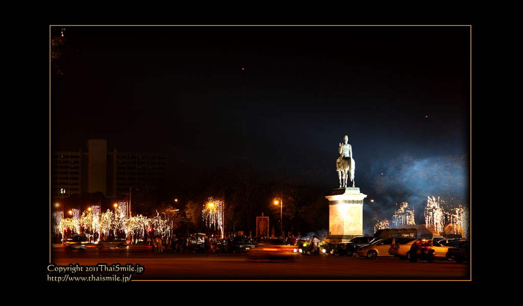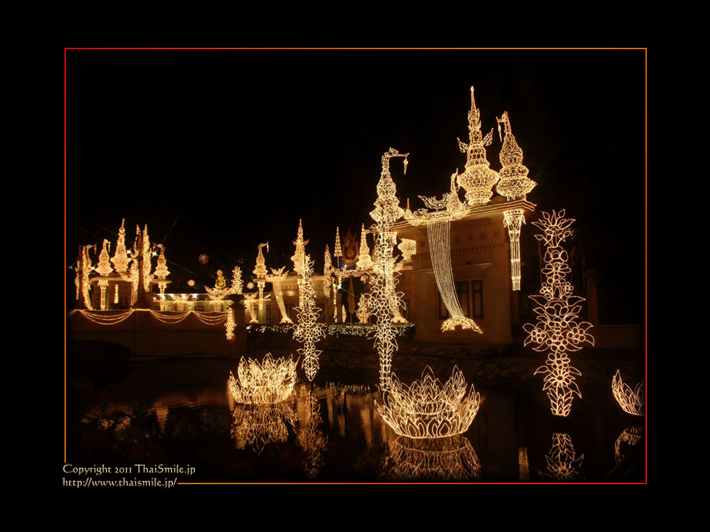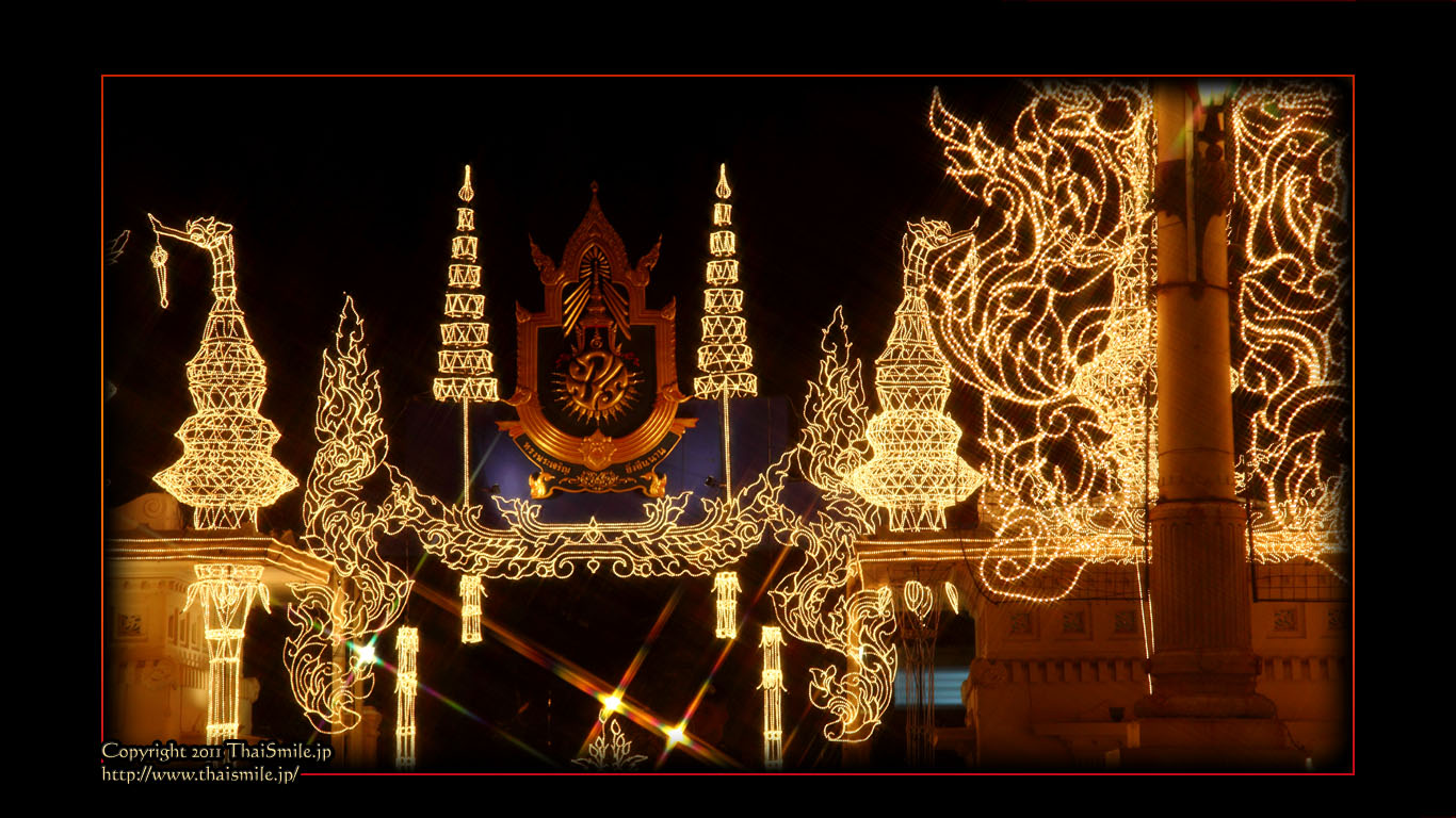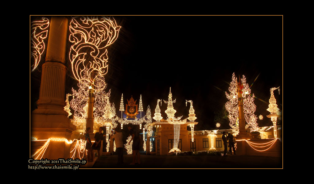 | Chitralada Villa, Dusit Palace バンコクでの国王の住居。その宮殿の前の夜の風景です。 電飾されて、とても綺麗ですね。 |