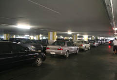 left.)I was very surprised when I saw this for the first time but this looks a usual thing in Thailand. (I noticed now that I already put this topic in the column no.21 long time ago.) When your car is blocked and/but you want to go out, you have to get the car in front away. For this, when you park your car in front of other cars which are already parked in car spaces, you must not use the parking brake to be moved when other cars want to go out. I ever read an article that when someone wanted to go out from a car space and tried to move another car in front but couldn't. The car was parked used a parking brake. He/she got really mad and beat and broke the car. Be careful to park a car in a parking lot in Thailand. :) |