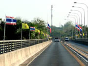 :D )Talking about holidays, national flags are put out in front of each house in Japan. My family was used to do that in old days but I don't think you often see this kind of scenery in a town these days. How about your family ? In Thailand, you'll notice the Thai national flag here and there. In tourists places, of course, and when you go across a bridge, a lot of flags can be seen so often like the picture above.In the picture right, that is a scenery of a river. The flag in red, white and blue is the national flag of Thailand. The yellowish colored flags are for Buddhism. Mostly, the national flag and Buddhism flag are in a row one after the other. I'm getting familiar with this scenery these days but this is one of Thai cultural things, I guess. :) |
