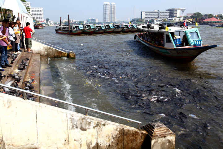 こちらは寺院の前のチャオプラヤー川の様子。徳を積む(タンブン)ための1つとして魚に餌をあげたりするんですが、すごい数の魚が集まってくるんですね。