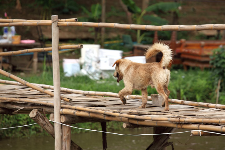 写真は、町を流れるパーイ川の竹の橋を渡る犬。またいつか行ってみたいです。