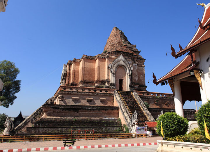 1391年にセーン・ムアン・マ王が建てたもので、タイでは最も重要であるエメラルド仏も一時ここに納められたそうです。1545年の暴風雨、地震から上部が半分崩壊して現在見られる姿になっているようですが、とても印象的な外観です。