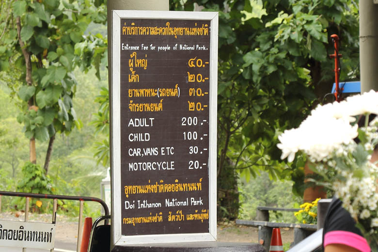 なぜだ―、どうしてだー、と声を大にして言うほどでもないんですが、これ、外国人料金とか呼ばれてます。写真はこの前のお休みに涼を求めてタイで一番高い山、タイ北部にあるドイ・インタノンへ久しぶりに行った時のもの。山のふもとのゲートにある料金表ですが、タイ語が分かる人は、あー、なるほど~(ニヤッ)、と思われるかもしれません。タイ語では「大人40バーツ、子ども20バーツ」、外国人向けは英語で「大人200バーツ、子ども100バーツ」となっています。